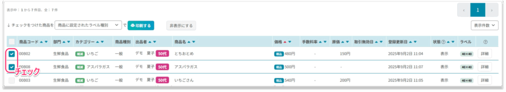 | ① ラベル印刷したい商品を選択(チェック)します。 |