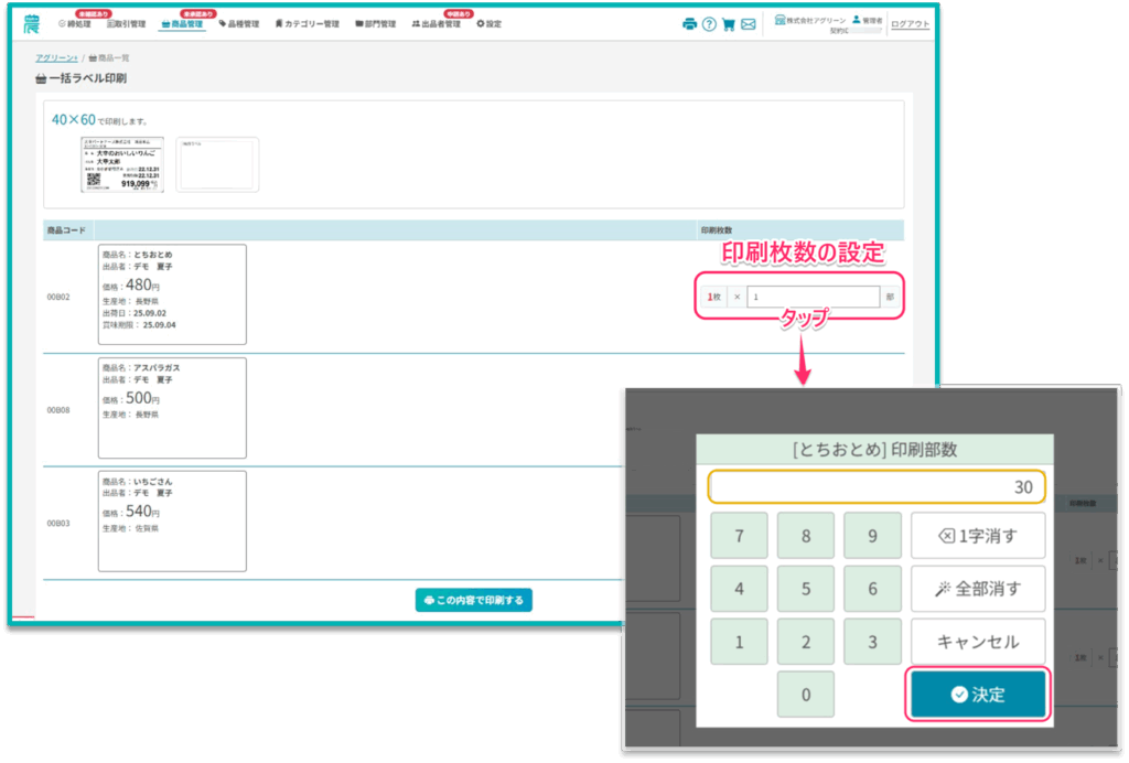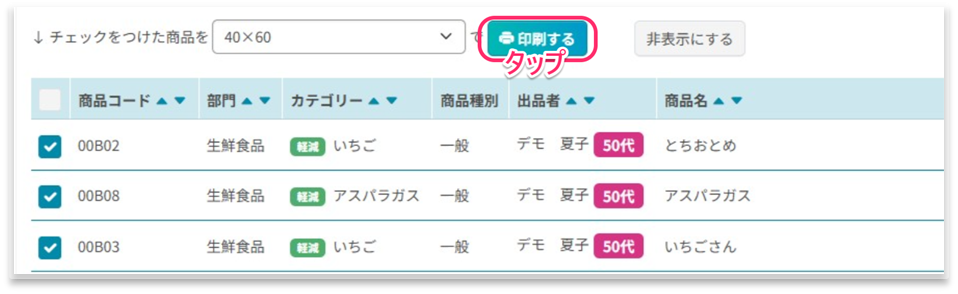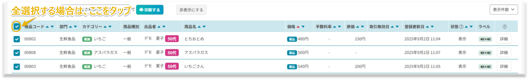 商品一覧から複数の商品を選択することで、それらのラベルを一括で印刷できます。