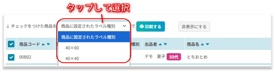一覧上部にあるプルダウンメニュー [商品に設定されたラベル種別] をタップし、