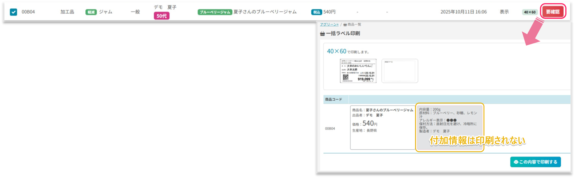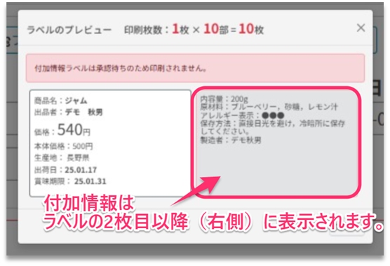| ラベルの付加情報がある場合は、店舗管理者が承認すると、 「付加情報ラベルは承認待ちのため印刷されません。」といったメッセージが消えて、 2枚目以降も印刷ができるようになります。 ![]() ↑ 付加情報を設定した場合のラベルプレビュー | |
