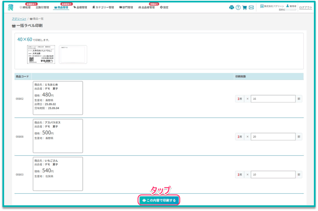 一括ラベル印刷画面に、選択した商品のラベル情報が表示されます。