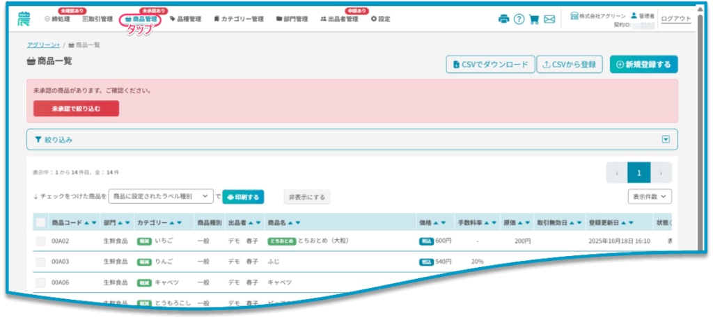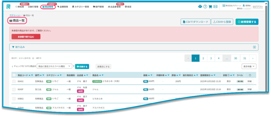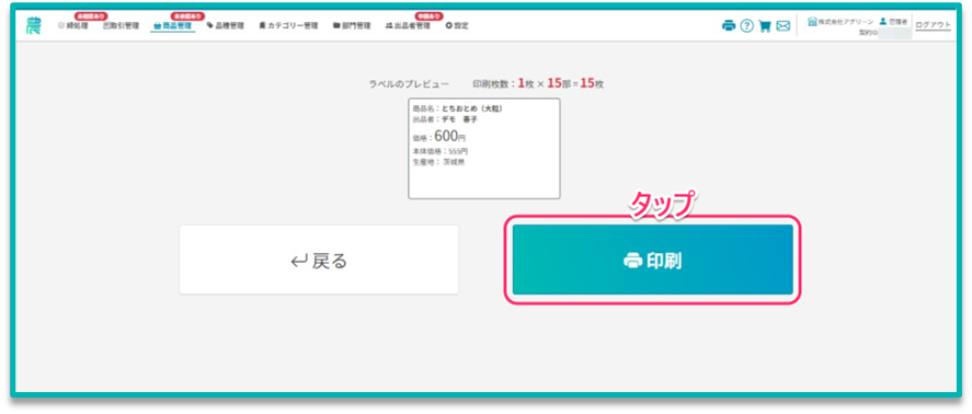 印刷が完了してアグリーンプラスに印刷取引が登録されると、自動的に商品一覧画面に戻ります。