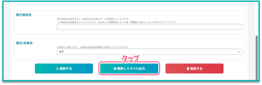 | ④ 「更新してラベル出力」ボタンをタップします。 |