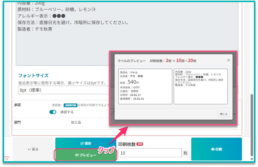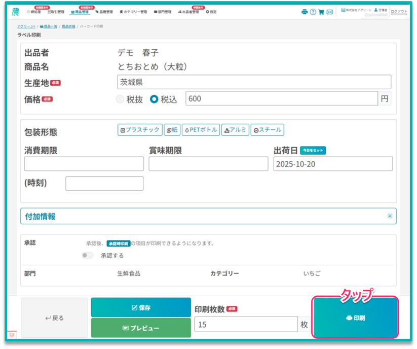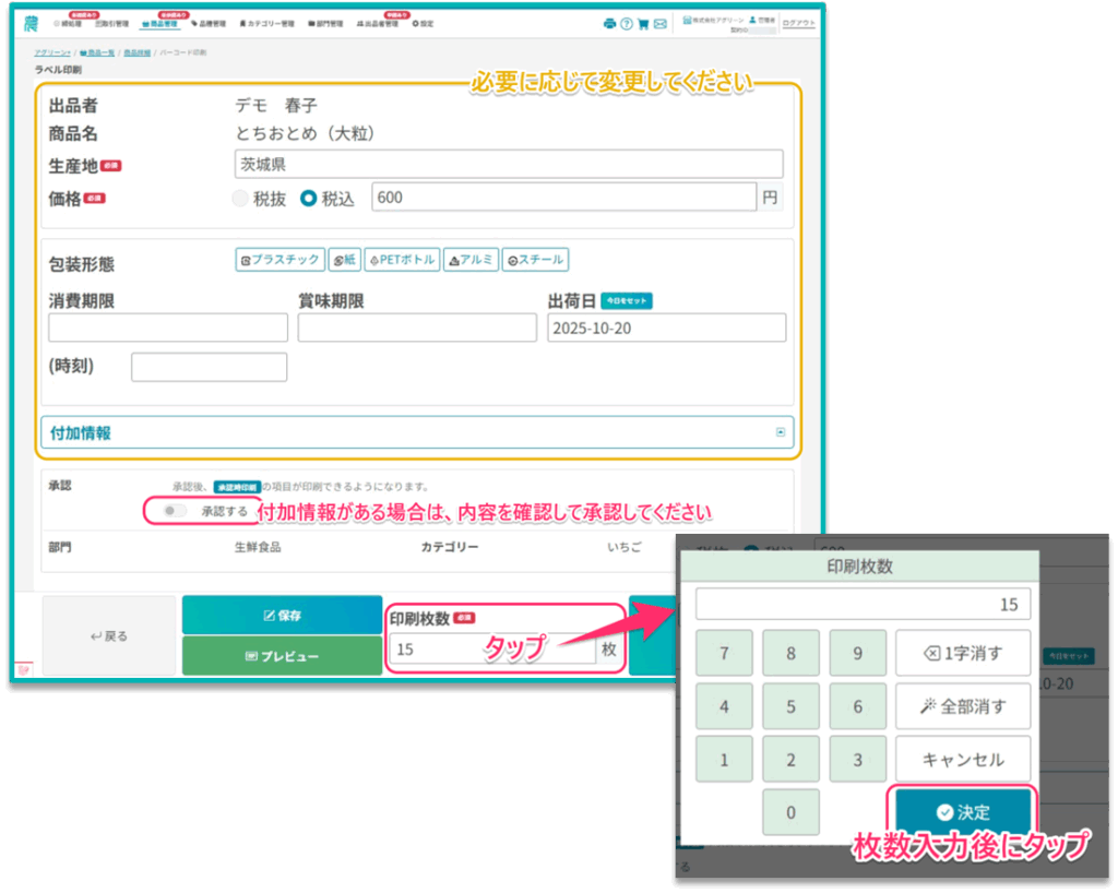 | 食品表示などの付加情報がある場合は、[承認する]をタップして承認してください。承認されない場合、ラベル2枚目以降の付加情報が印刷されませんのでご注意ください。 | |