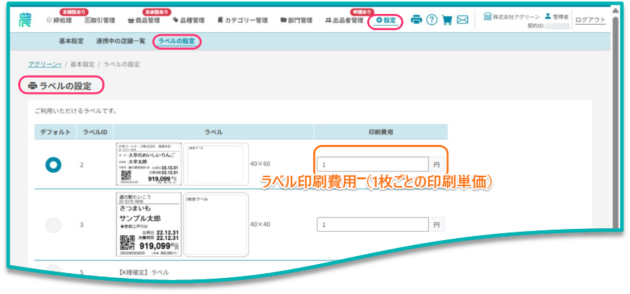 アグリーンプラスの「設定」≫「ラベルの設定」で、ラベル印刷費用(1枚ごとの印刷単価)が登録されている場合、ラベル印刷を実行するたびに、取引一覧にラベル代が経費として計上されます。![]() ↑ アグリーンプラス≫設定≫ラベルの設定(印刷費用) |