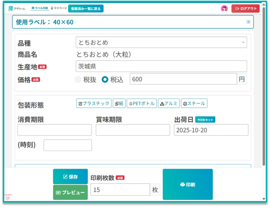印刷が完了してアグリーンプラスに印刷取引が登録されると、自動的にラベル印刷設定画面に戻ります。