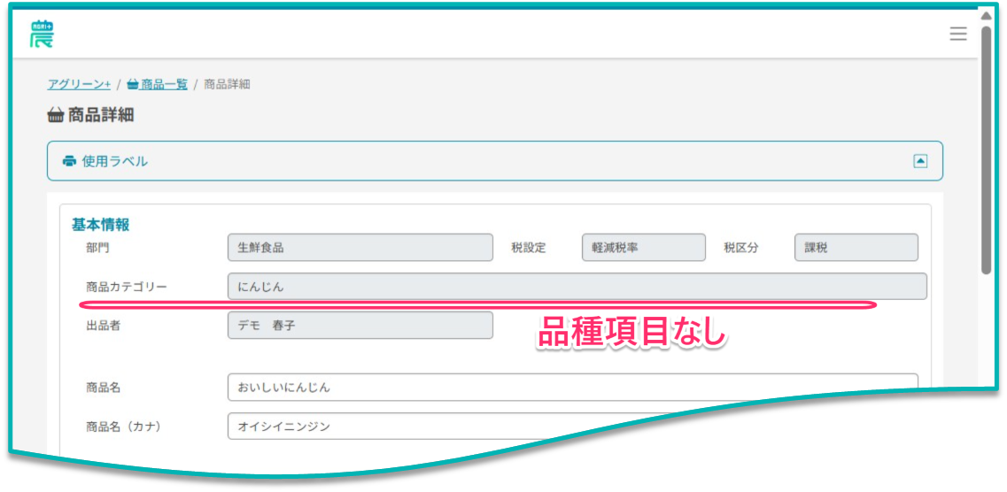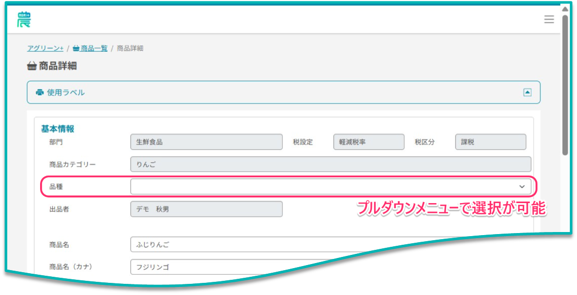 | 商品詳細画面 では、商品カテゴリーに品種が登録されているかどうかによって、 表示内容に若干の違いがあります。 商品カテゴリーに品種が登録されている場合 品種項目のプルダウンメニューから選択できます。 ※選択は必須ではありません。 ![]() 商品カテゴリーに品種が登録されていない場合 品種項目は表示されません。 ![]() |