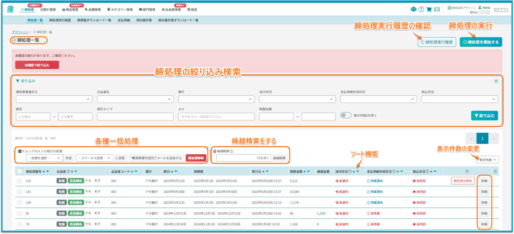 また、締処理を並べ替えたい場合は ソート機能 を、条件を指定して絞り込みたい場合は 絞り込み検索 をご利用ください。さらに、一覧の表示件数を変更することもできます。