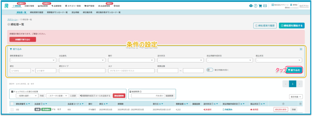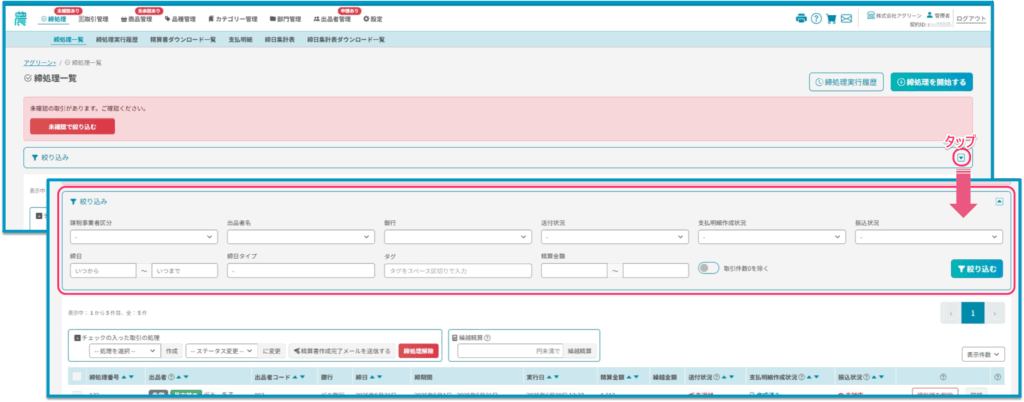 絞り込み機能 を使って、締処理一覧に表示する 締処理 を任意の条件で 絞り込む ことができます。