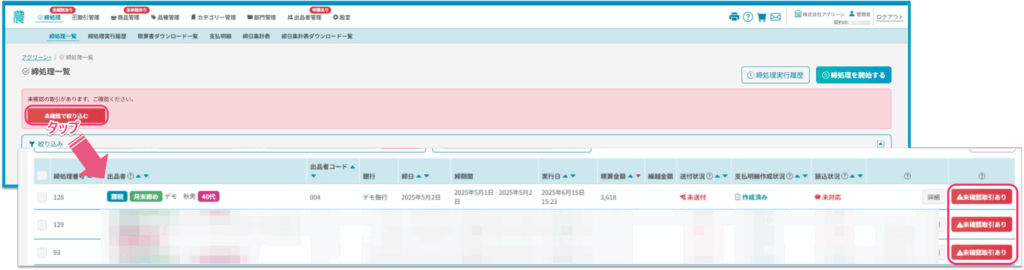 [未確認で絞り込む] ボタンをタップすると、未確認取引を含む締処理だけを表示できます。未確認取引を確認する際にご利用ください。