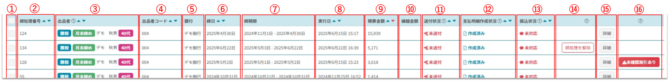 | ② | 締処理番号 | 締処理を実行した際に自動的に割り振られる番号です。 ※ ▲▼ソートできます。 |