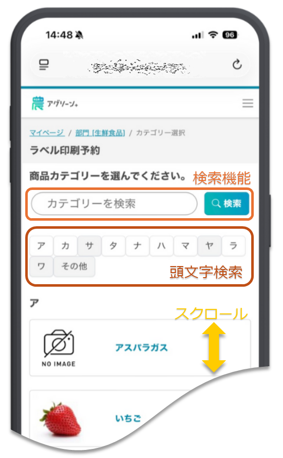 登録している商品カテゴリーが多い場合は、検索機能や頭文字による絞り込み機能、また、画面の上下スクロールなどをご利用してお探しください。