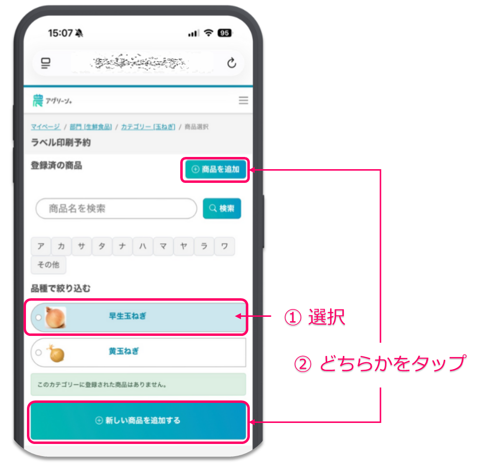 品種を選択する場合 は、 ① 品種選択 して、 商品を追加 または新しい商品を追加する]ボタン をタップ してください。※ 品種を選択すると、選択された品種の背景色が変わります。(下図参照)