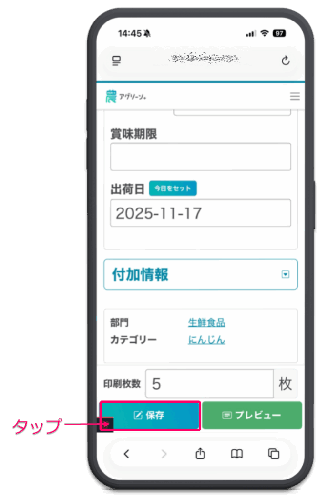 商品情報の入力画面 で、ラベルの種類設定商品情報の入力印刷枚数の入力 が完了しましたら、画面下部の [保存] ボタンをタップしてください。