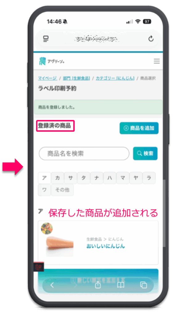 保存が完了すると、ラベル印刷予約画面 のトップページに戻り、「商品を登録しました。」というメッセージが表示され、「登録済の商品」欄に商品が追加されます。これで印刷予約は完了です。