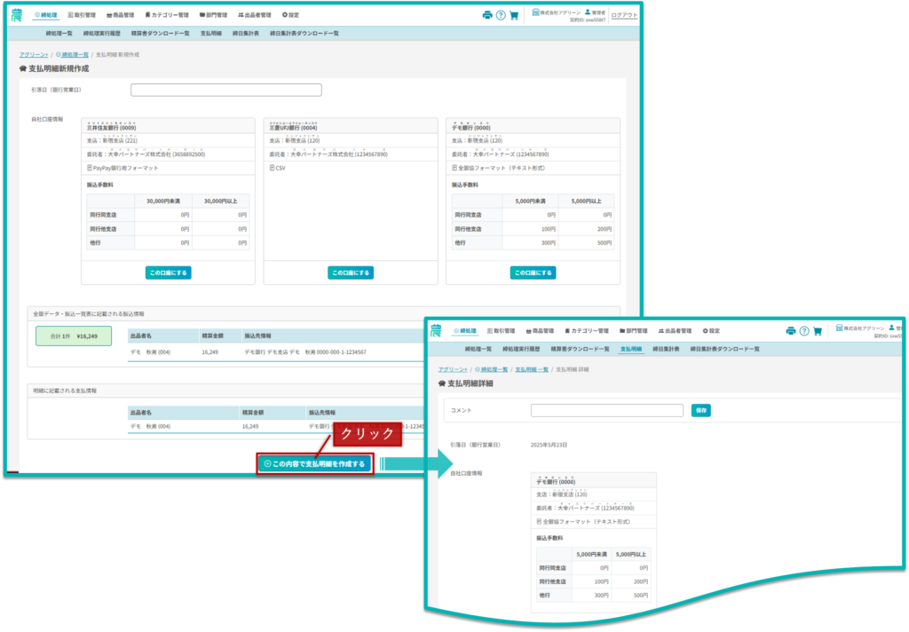 | アグリーンプラスの管理者メニューで 1.「締処理」を クリック し、 2.締処理一覧から該当する締処理を選択 し、 3.支払明細新規作成画面で必要な情報を設定後、 「この内容で支払明細を作成する」ボタンをクリックすると、 支払明細の作成が完了し、支払明細詳細画面が開きます。 (※ 「支払明細を作成する」ページ参照) ![]() ↑ (左図)締処理:支払明細作成≫支払明細新規作成画面 (右図)支払明細詳細画面 |