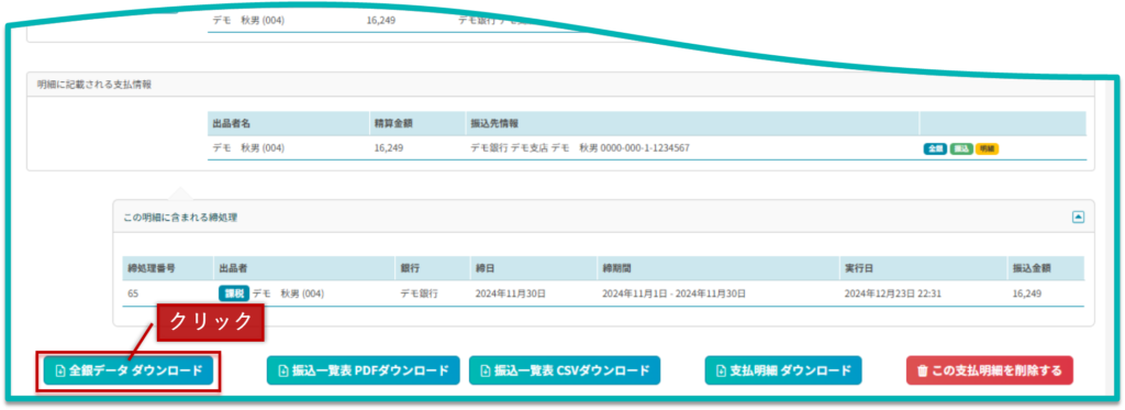 支払明細詳細画面の下部にある「全銀データダウンロード」ボタンをクリックすると、全銀データをダウンロードできます。