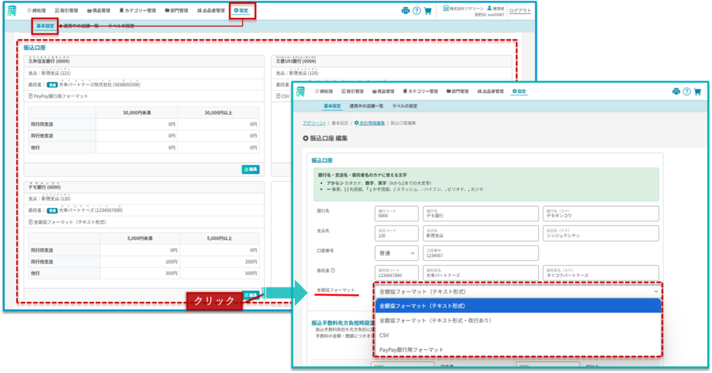 ![]() ↑ アグリーンプラス≫管理者ログイン≫設定:基本設定≫振込口座登録 | |