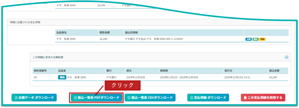 支払明細詳細画面の下部にある「振込一覧表PDFダウンロード」ボタンをクリックすると、振込一覧表をPDF形式でダウンロードできます。