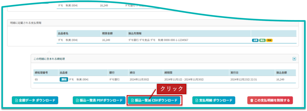 支払明細詳細画面の下部にある「振込一覧表CSVダウンロード」ボタンをクリックすると、振込一覧表をCSV形式でダウンロードできます。(ファイル名は、yyyyMMdd_振込一覧表.csv)