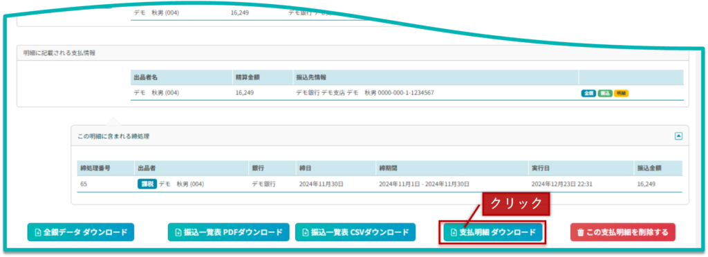 支払明細詳細画面の下部にある「支払明細ダウンロード」ボタンをクリックすると、支払明細をPDF形式でダウンロードできます。