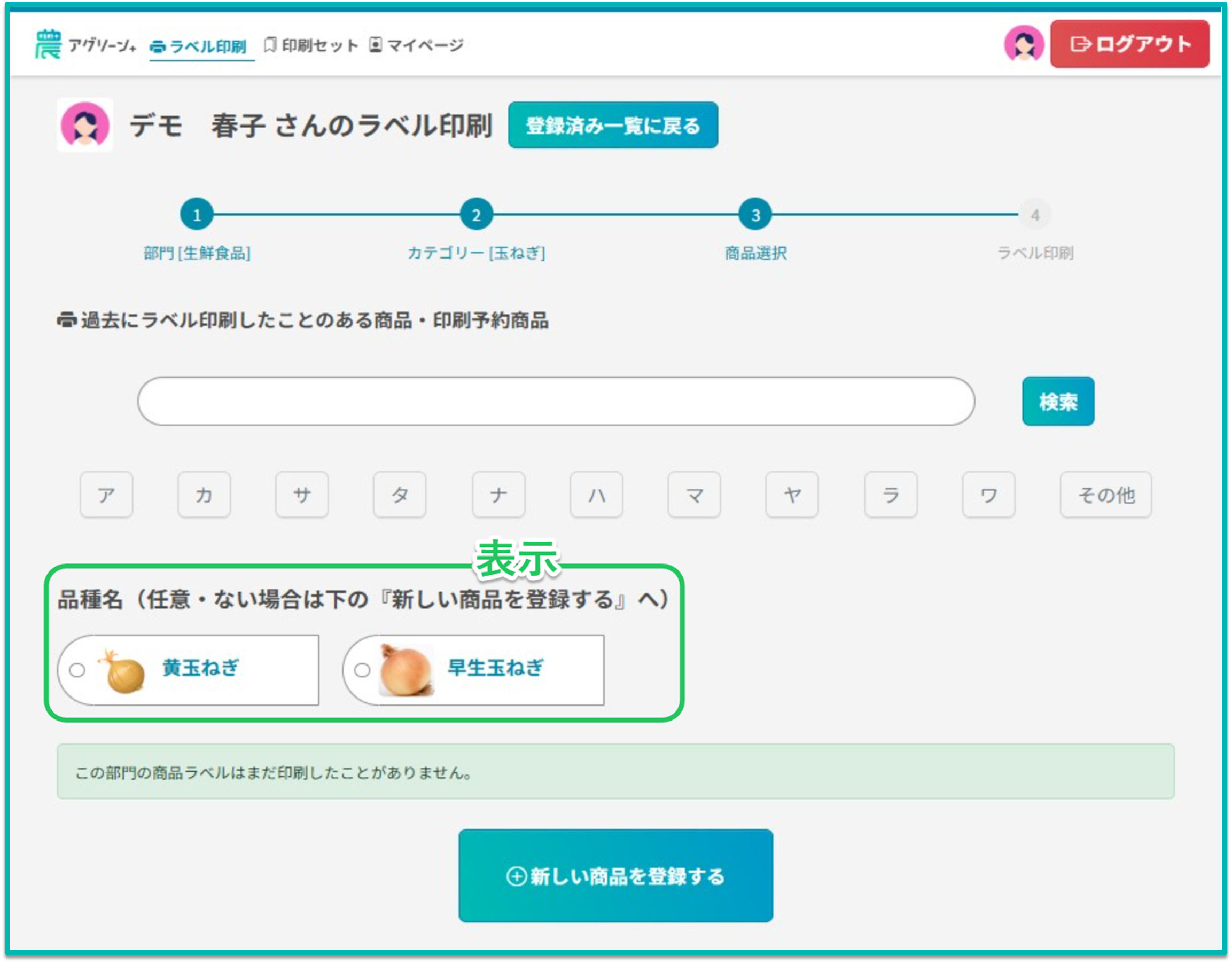 表示の場合出品者向けの ラベル印刷画面≫商品の新規登録≫…≫商品選択画面 にて「品種名」欄 品種が表示 されます。(下図)