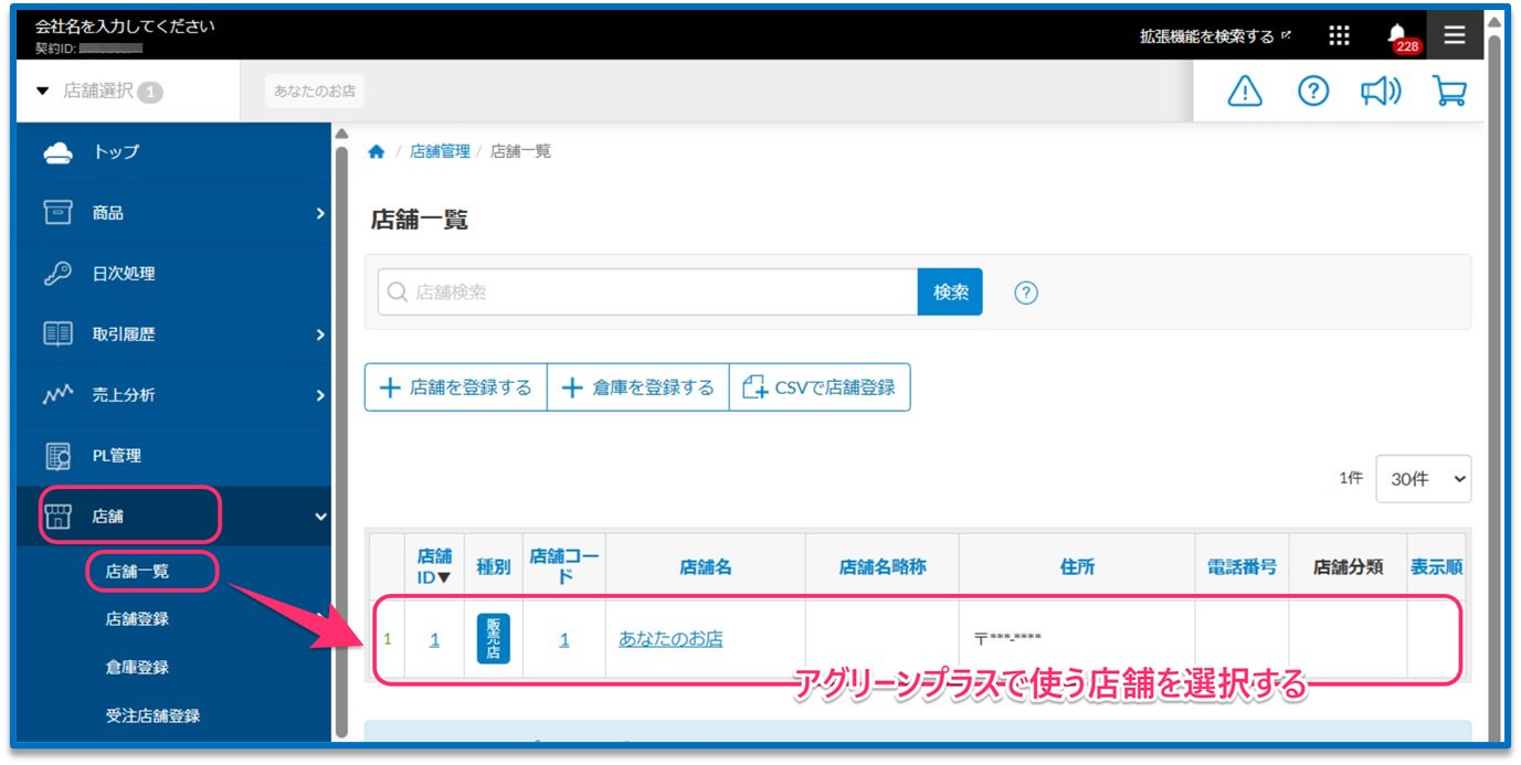 店舗一覧画面 を開きます。店舗一覧からアグリーンプラスと連携している店舗を選択してください。
