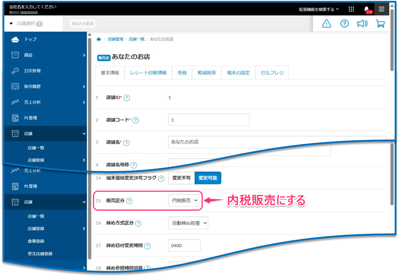 次に、選択した店舗の 設定画面 が開きますので、「販売区分」を「内税販売」に設定してください。
