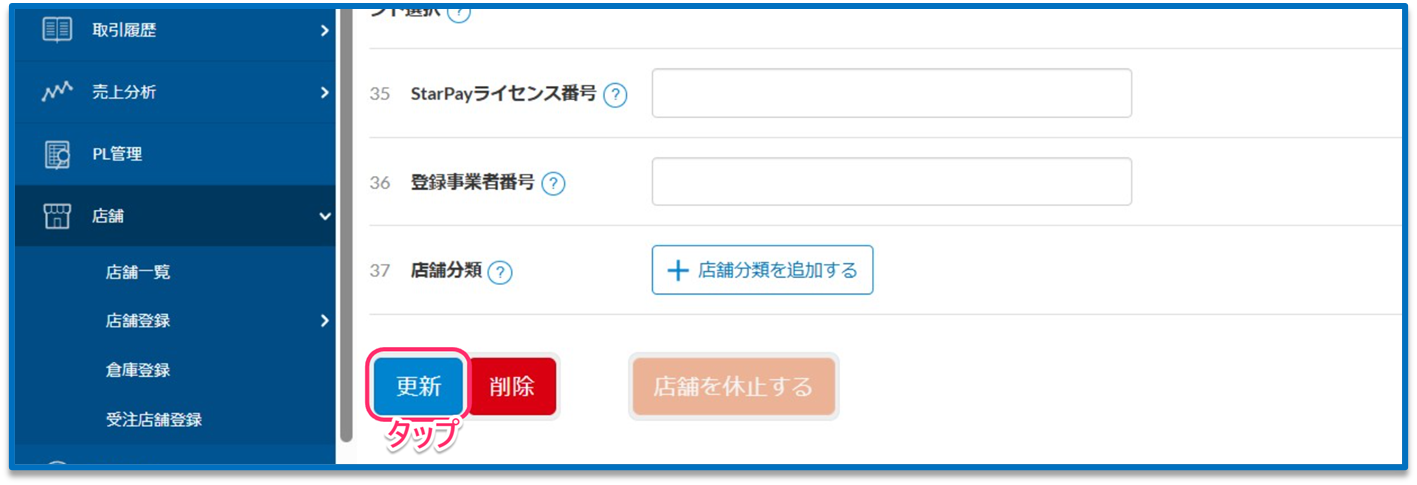 ↑ スマレジ管理画面≫店舗≫店舗一覧画面≫該当店舗の設定画面
