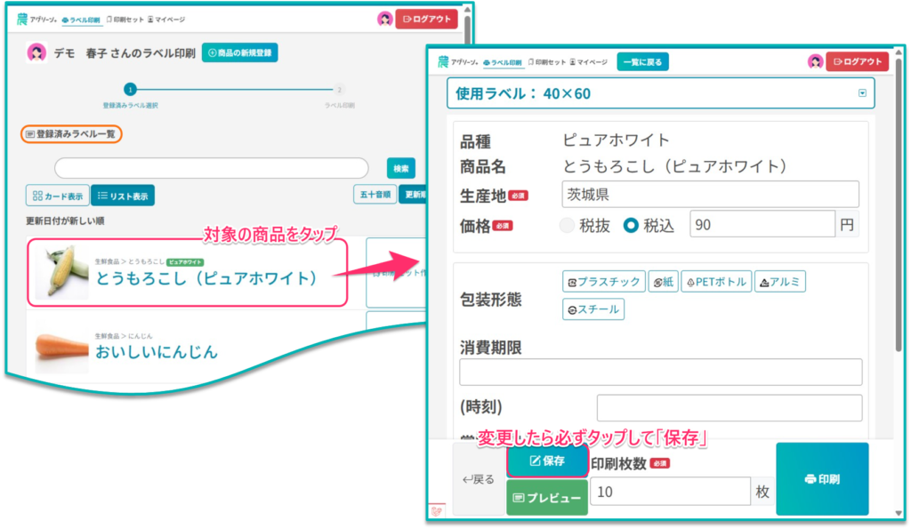 | 生産地 包装形態 出荷日 消費/賞味期限 変更後は、必ず[保存]ボタンをタップして保存してください。 | ||