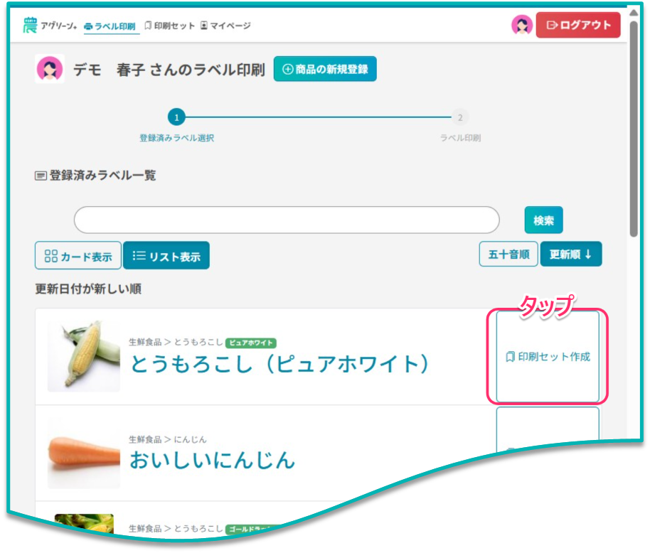 ラベル印刷画面の「登録済ラベル一覧」を開き、対象商品の[印刷セット作成]ボタンをタップしてください。![]() ↑ ラベル印刷:登録済みラベル一覧 |