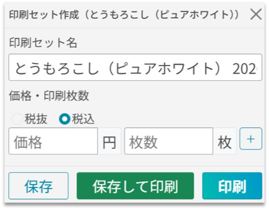 | 保存して印刷 | 印刷セットを登録して、印刷プレビュー画面 へ進みます。 ※ 詳細は、「【店舗】印刷セットでラベル印刷する」ページの「手順③ 印刷セットを印刷します」以降 をご確認ください。 | ||