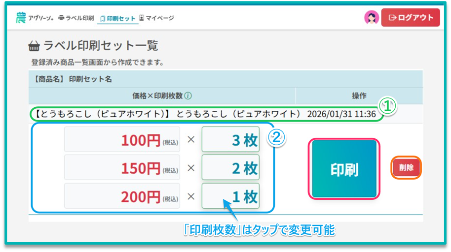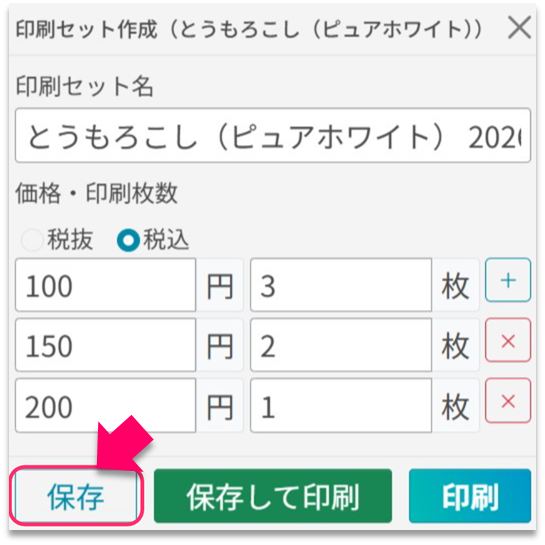 | ② | 価格・印刷枚数 | ラベルに表記する価格 と 印刷するラベルの枚数 を入力してください。 [+] ボタンをタップすると、行追加できます。 [×]ボタンをタップすると、行削除できます。 | |