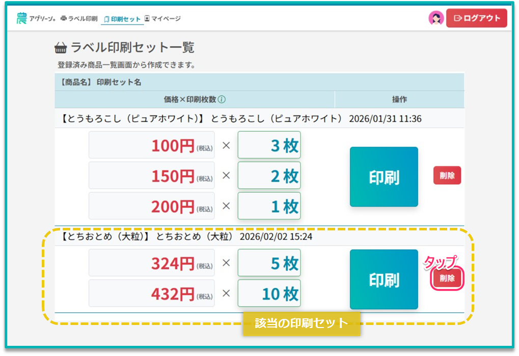 削除が完了すると、該当の印刷セットは「ラベル印刷セット一覧」から削除されます。