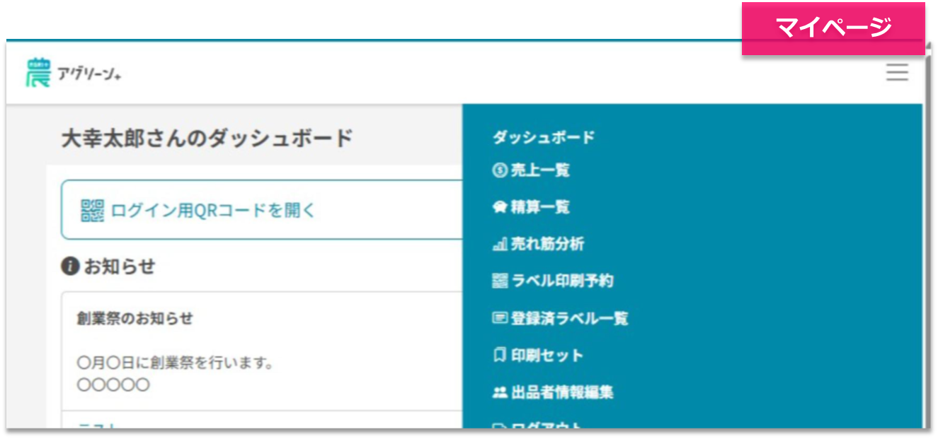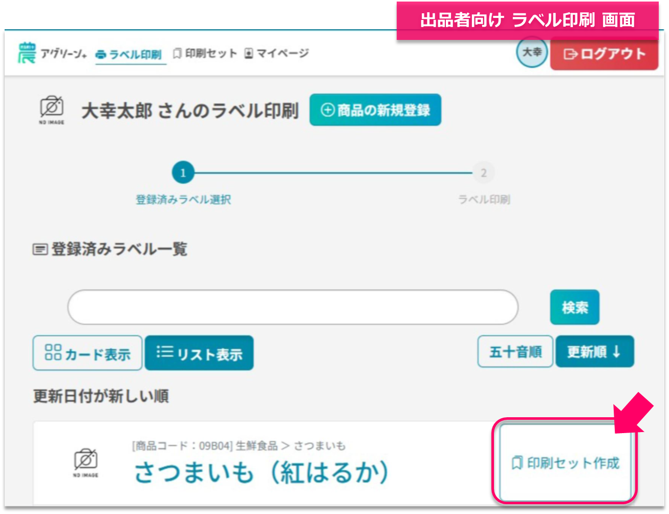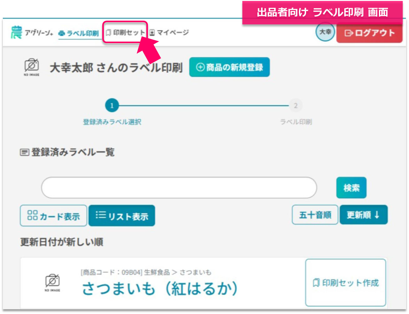 印刷セットのラベル印刷は、出品者ログイン後にメニュー表示される[印刷セット]から行えます。
